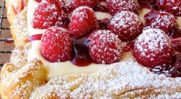 გამომცხვარ ფენას წაუსვით ხაჭოს მასა და ზემოდან მოასხით ჟოლოს სიროფი