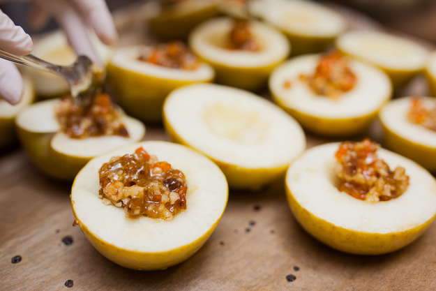 კარგად გარეცხილ ვაშლს ზედა ნაწილი მოაჭერით. შეგიძლიათ ქვემოდანაც ოდნავ წააჭრათ, რომ უფრო მყარად დადგეს. თესლებიანი ბუდე ამოაცალეთ. გულამოცლილ ვაშლებს ლიმონის წვენი მოასხით.