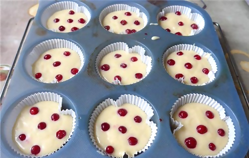 გაახურეთ ღუმელი 180 გრადუსზე. ცომი გაანაწილეთ კექსის ფორმებში, ოღონდ მთლიანად არ გაავსოთ. მოსართავად გამოიყენეთ ნებისმიერი კენკრა ან ჯემი.