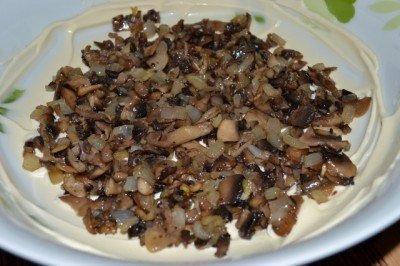 პირველი ფენა – ხახვთან ერთად შემწვარი სოკო;