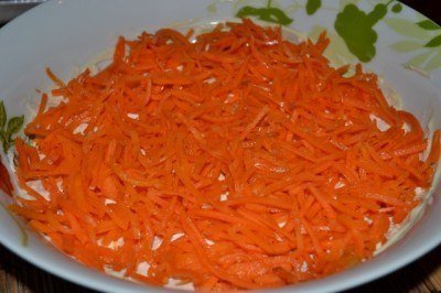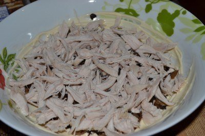 მეორე ფენა – მოხარშული და დაჭრილი ქათმის ფილე;