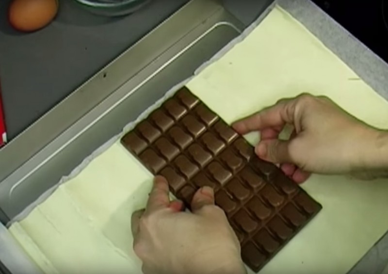 გაფინეთ მაგიდაზე საცხობი ქაღალდი და ზედ დადეთ ფენოვანი ცომი. გააბრტყელეთ, მოათავსეთ შოკოლადის ფილა ცომის შუა გულში, როგორც ნაჩვენებია სურათზე.