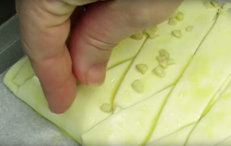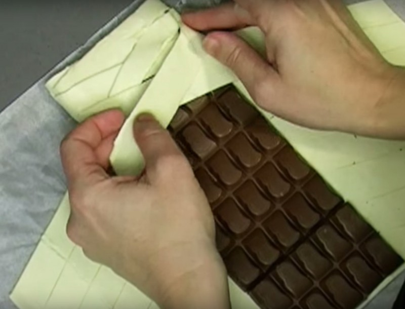 შემდეგ დაიწყეთ მიღებული ცომის ჩაჭრილი ნაწილების ჯვარედინად დაწყობა შოკოლადის ფილაზე, თითქოს აკეთებთ „ნაწნავს“.