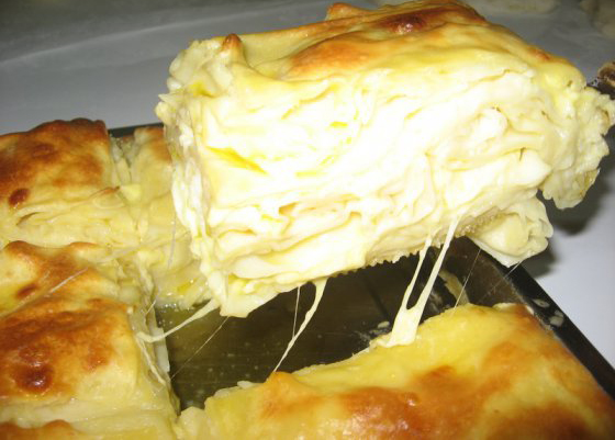 პირველ ფენას ზემოდან მოვუსვათ გამდნარი კარაქი, დავადოთ მეორე ფენა, რომელზეც თანაბრად გავანაწილებთ წვრილად დაქუცმაცებულ ყველს. ასეთი თანმიმდევრობით დააწყვეთ ათივე ფენა.
