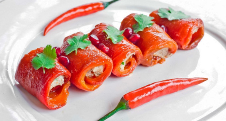შიგთავსის მცირე ნაწილი დადეთ წიწაკაზე და გადაახვიეთ რულეტში