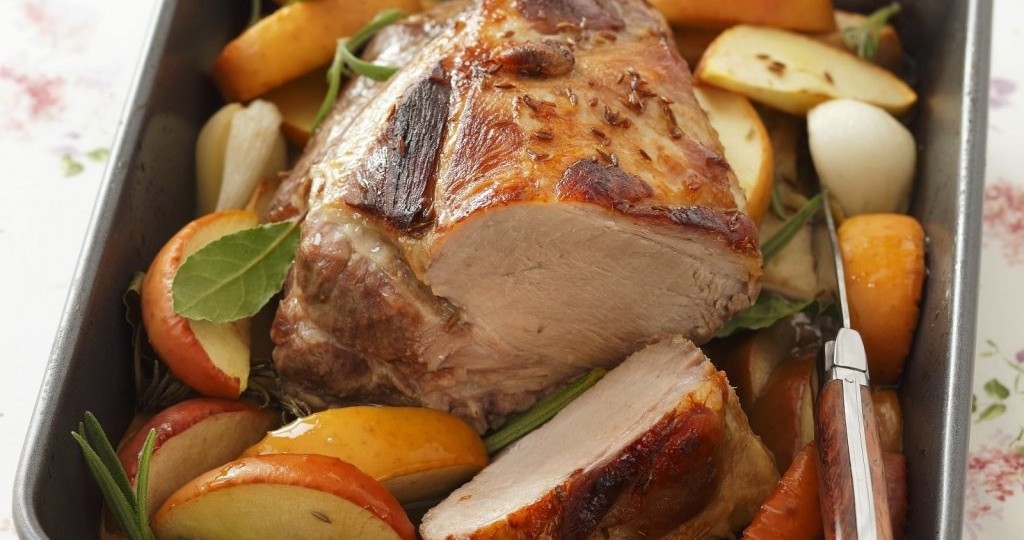 თეფშებზე ჯერ ვაშლი გადაანაწილეთ და შემდეგ ზემოდან დაადეთ თითო ნაჭერი ღორის ხორცი