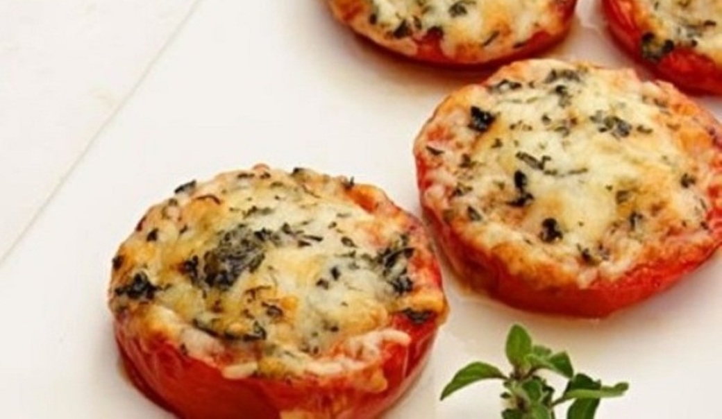 გაჭერით პომიდორი შუაზე და დააწყეთ ტაფაზე გაჭრილი ადგილით ზევით